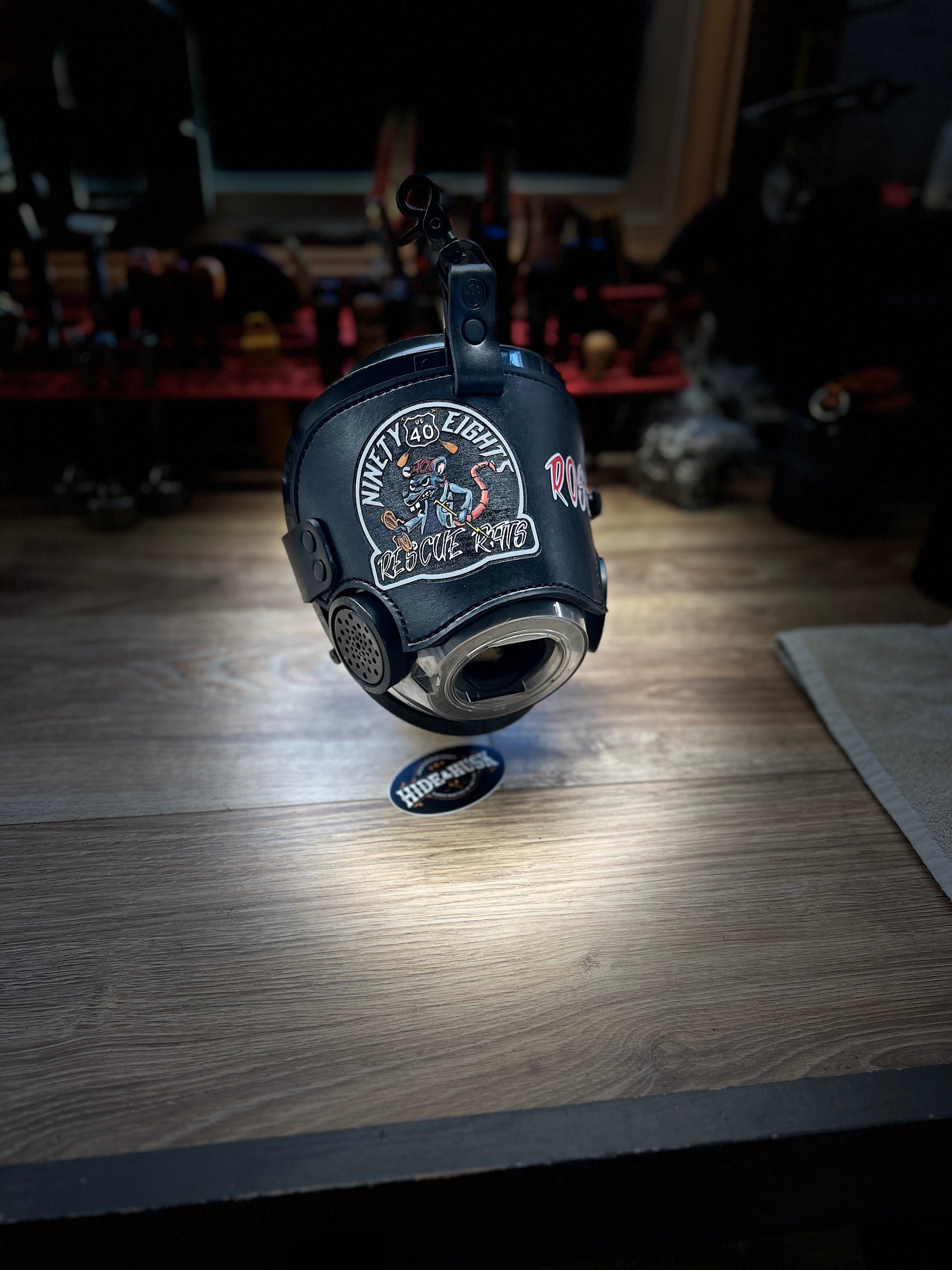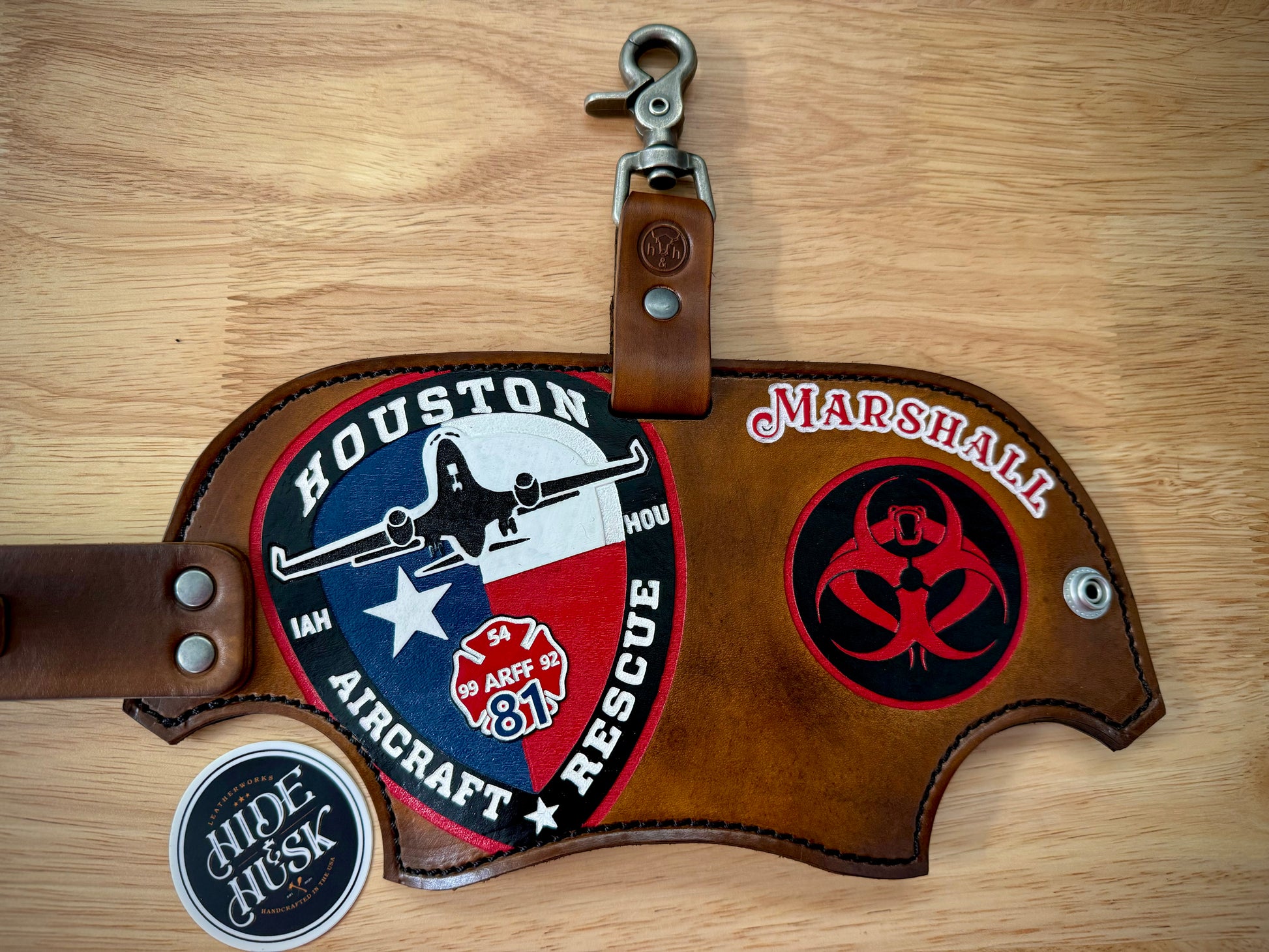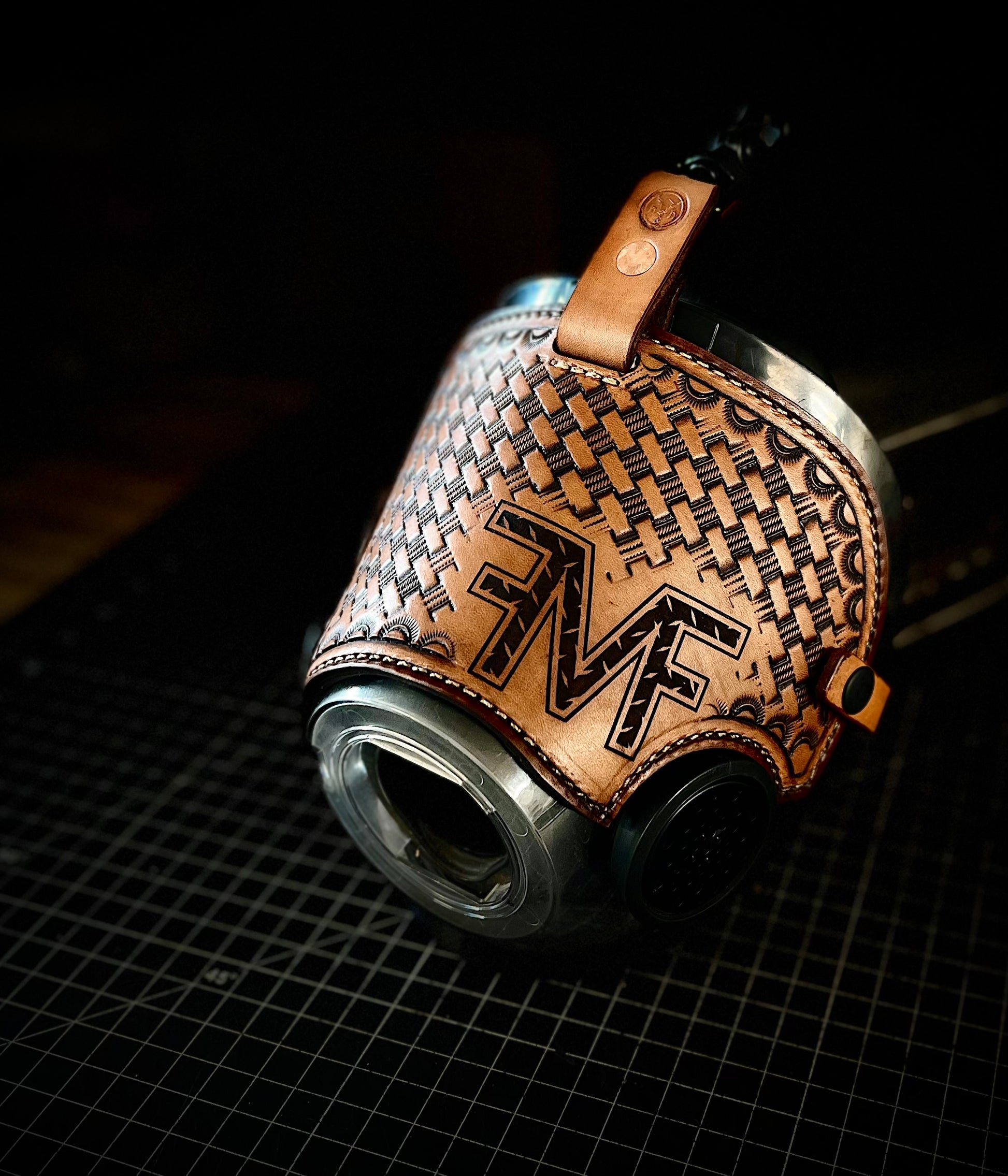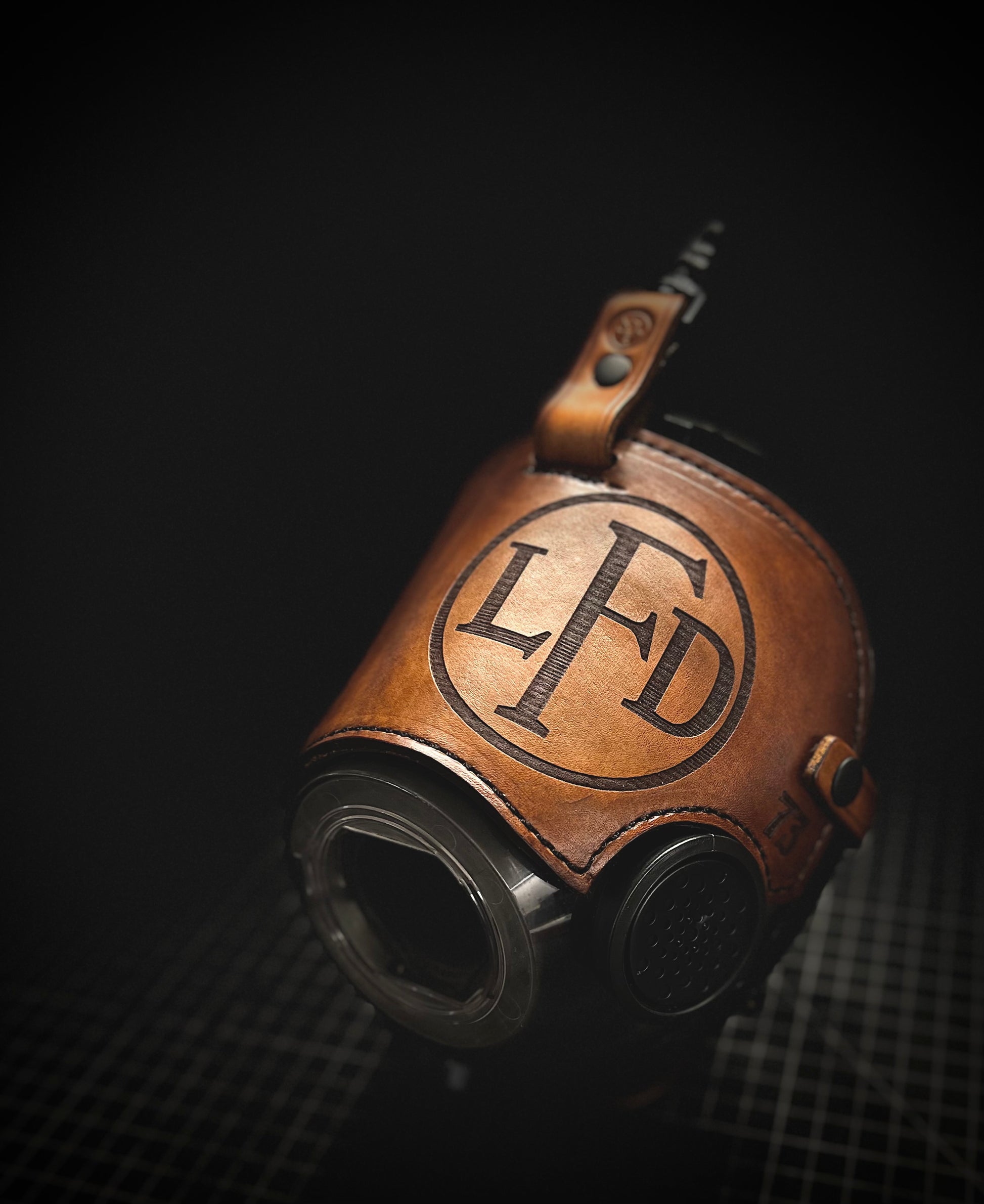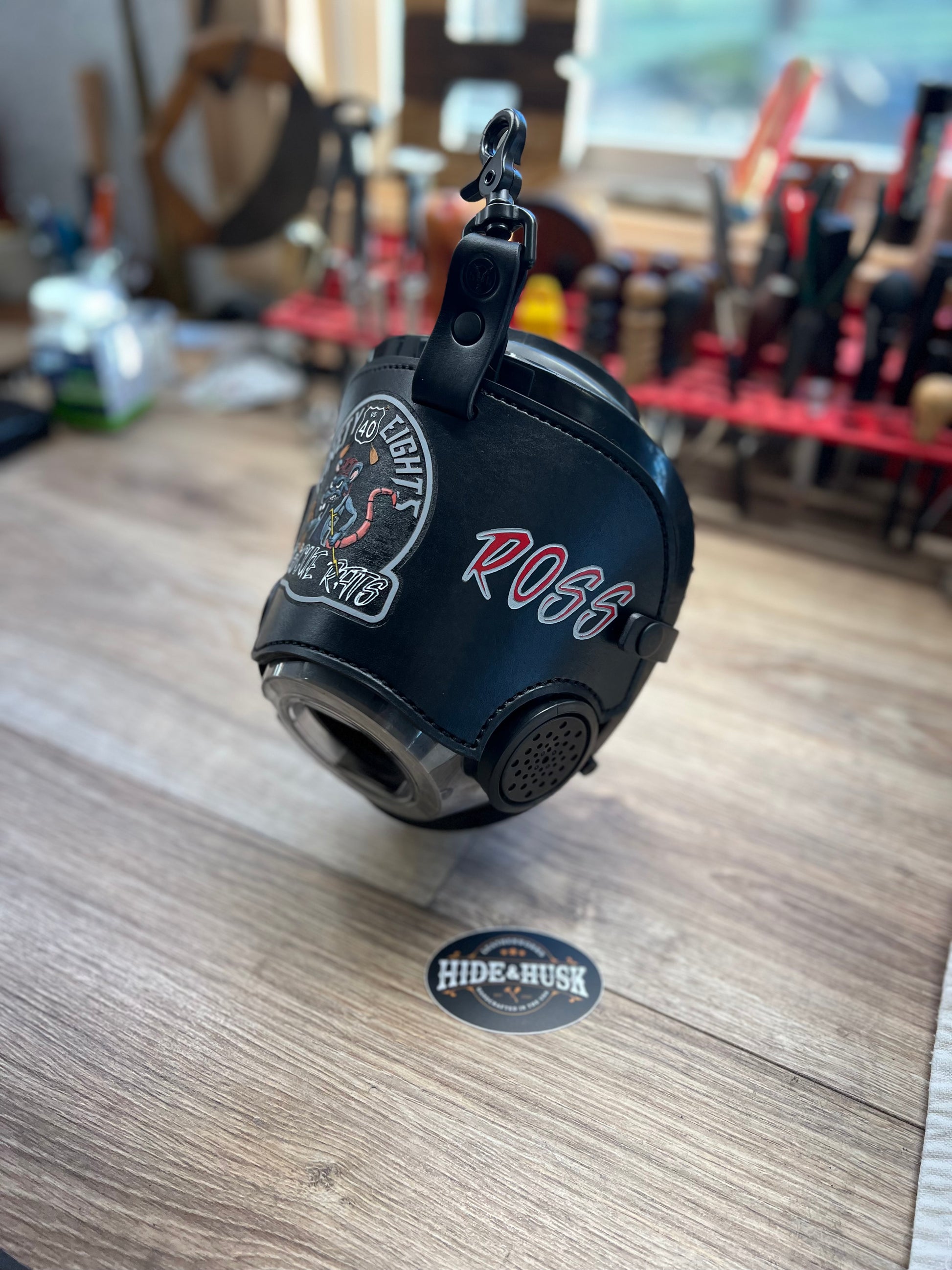 SCBA Mask Cover made specifically for the Scott AV3000 mask. Each cover is laser cut and assembled by hand. They are made from top grain leather and backed with a thin piece of butyl rubber. These covers are truly one of a kind and are made to withstand the abuse of the job. With a quick consult either by phone or email we can get a design started for you.